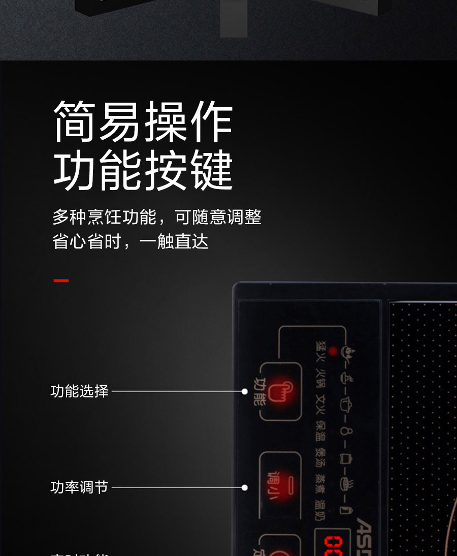 产品特点:四位数码显示,按键操控,多项智能烹饪功能,随意可调,特设文火慢炖功能