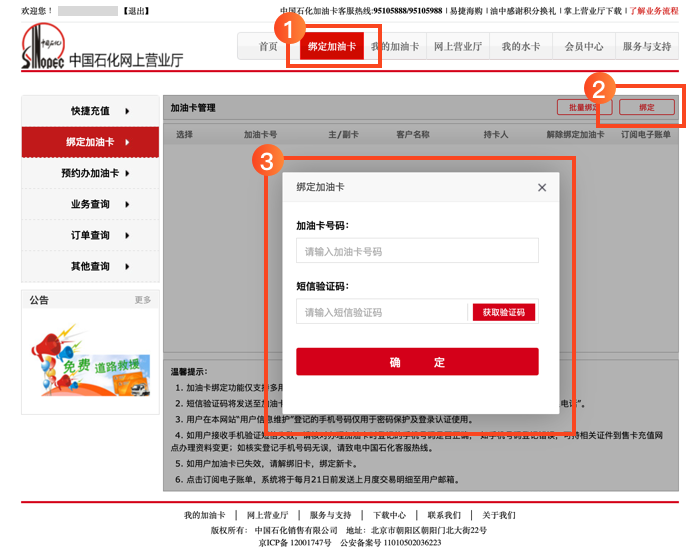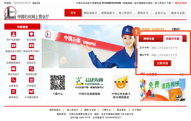8、中石化加油IC卡办理、充值、使用等事宜以当地中石化官方说明为准,如使用过程中有任何疑问请致电中石化客服: 95105988/95105888。
